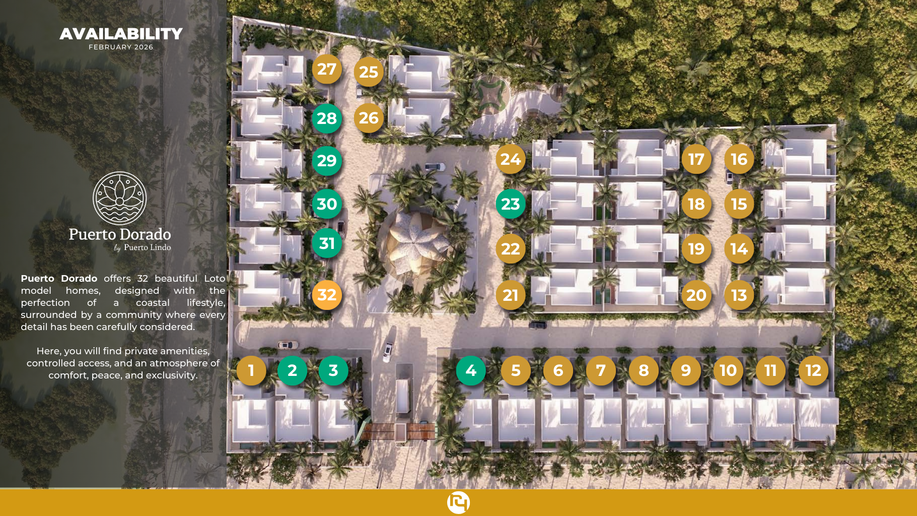 Gated community of 32 single-story homes with 3 bedrooms and a pool in Chelem, Yucatán. Located within the larger Puerto Lindo development. Just 3 blocks from the beach and with access to the Bonita Beach Club.